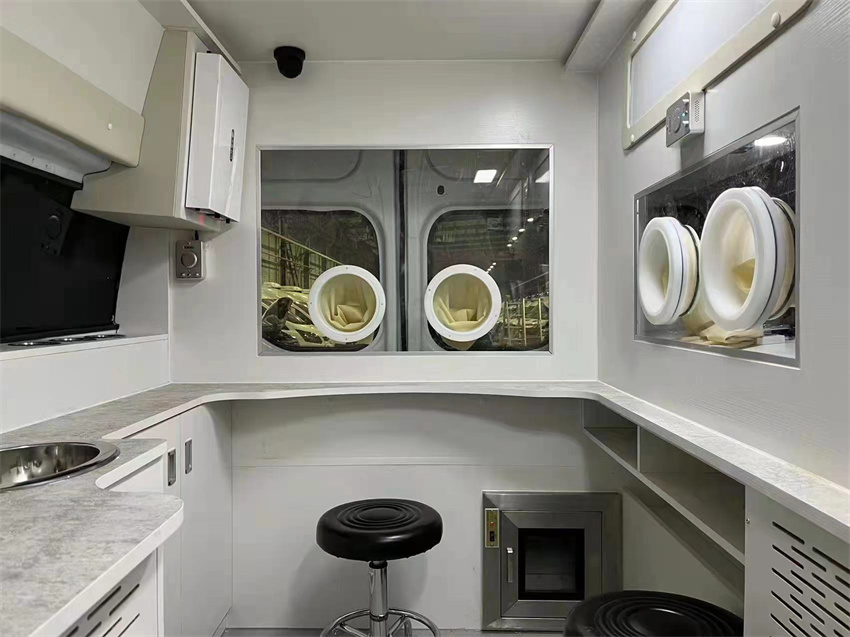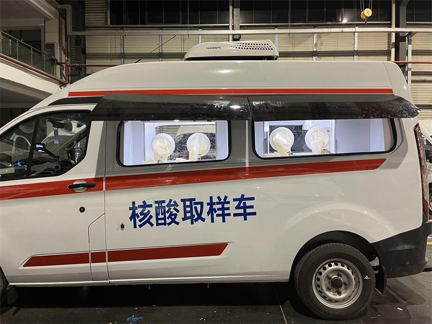 核酸检测采样车,采用江铃福特推出的福特新全顺底盘改装。整车参考 PCR 检测实验室及移动实验室等相关行业标准,集成正压防护、温度调节、对讲、样品传递、车内消毒等功能,可迅速部署于户外,为群体核酸咽拭子采样、样品登记及样品整理提供有力支撑;在整个作业过程中确保医务工作人员与受检人员无直接接触,最大限度的保障了一线医务工作人员的作业安全,为新型冠状病毒核酸样本采集及样品整理提供了防护屏障及舒适的工作环境。