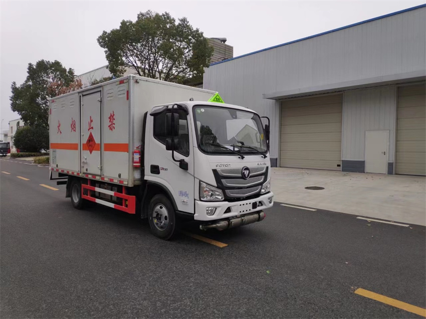 右开单侧门,厢体为双层金属骨架结构,外冷轧钢板内饰铝板,内壁采用铝合金板蒙面,夹层为隔热阻燃材料填充,厢体内部做通风窗口,厢体内部做防静电处理,厢体底部铺导静电胶板,车辆副梁配备导静电带,厢体内衬壁装单排卧环,厢体内顶部安装气体报警器,厢体安装防盗报警器,随车配备手提灭火器,危险品三角顶灯,防护帽等