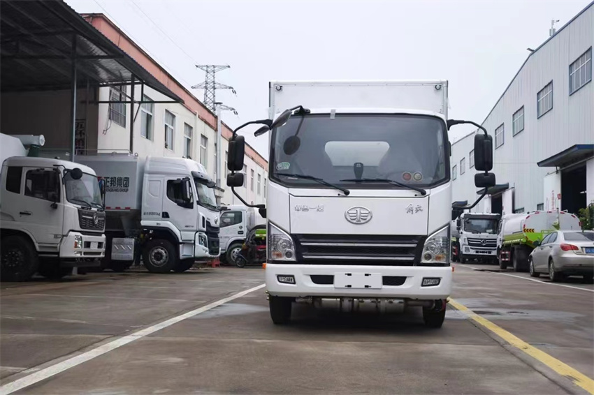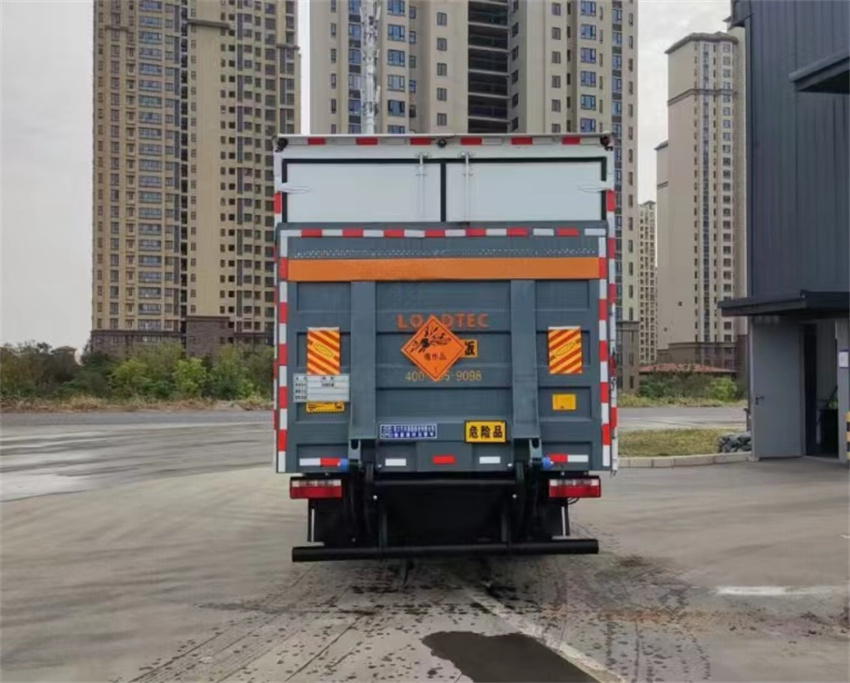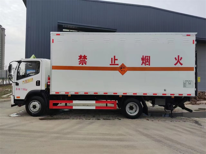 右侧单开门,厢体为双层金属骨架结构,外冷轧钢板内饰铝板,内壁采用铝合金板蒙面,夹层为隔热阻燃材料填充,厢体内部做通风窗口,随车配备手提灭火器,危险品三角顶灯,防护帽等,整车不超重。