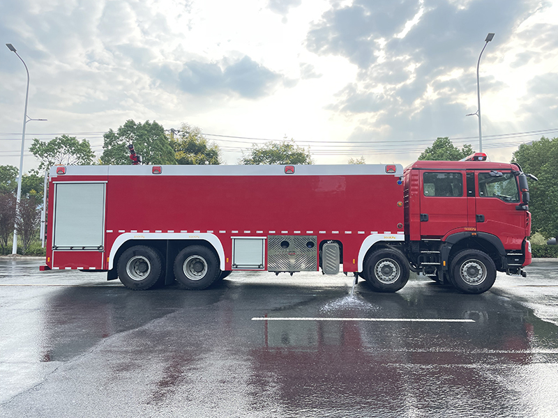 备注:选装右侧安装不同样式的装饰板和选装后部带拉梯架装置。罐体总容积为24.724立方米,水罐容积:20.900立方米,水罐尺寸:5840×2450×1530mm,泡沫液罐容积:3.824立方米,泡沫液罐尺寸:1070×2450×1530mm。整体式侧防护结构,后防护装置材料:Q23 **,截面尺寸:120×120mm,与车辆连接方式:螺栓连接,后防护离地高度:465mm, A BS生产企业为威伯科(上海)管理有限公司型号为4460046300。主要专用装置有CB10/100消防泵、PL80消防炮,水射程≥70m,泡沫射程≥65m。 |