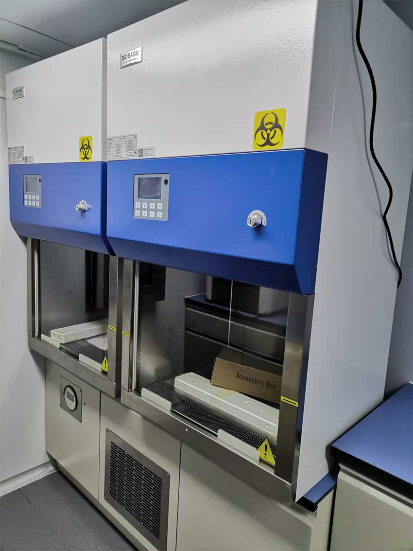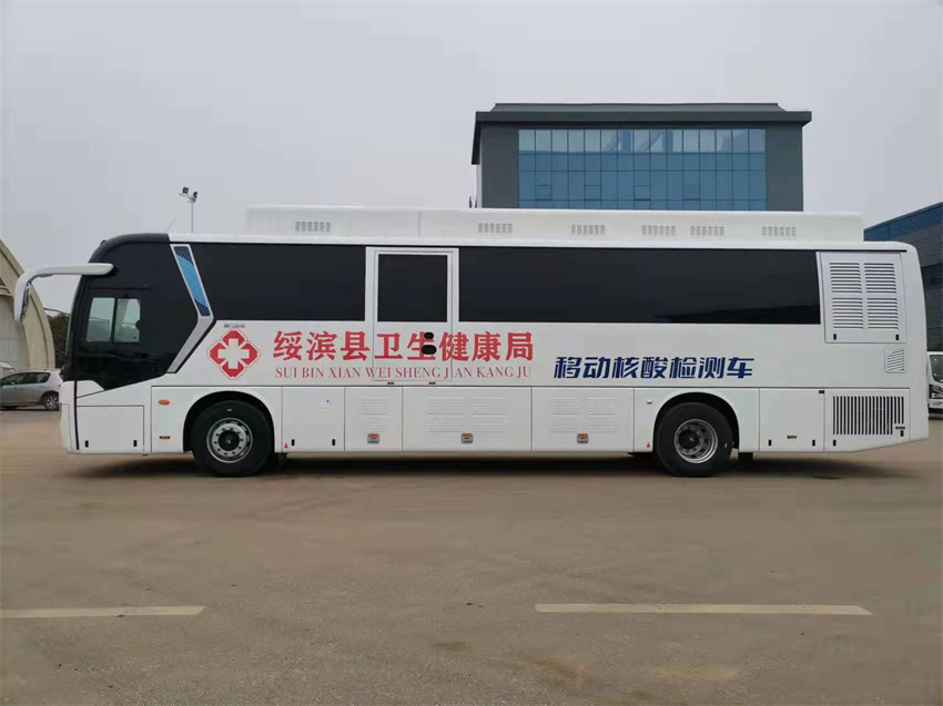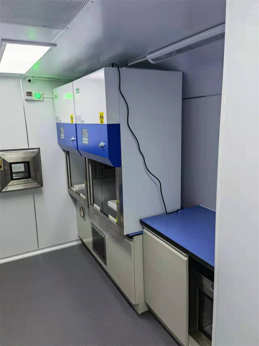 自动化核酸检测车符合加强型二级生物安全(P2+)实验室的要求。实验设备在车 内固定,能经受长途运输考验,并确保驻车后可以快速开展实验检测。车架配 备气囊防震和液压支撑架,适合多种平整地形。配备快速接电装置,可快速连 接市电进行应急使用。