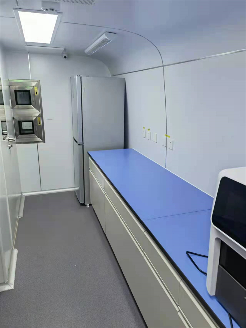 功能全面:自动化核酸检测车集成了标准PCR实验室的三区功能,能独立开展工 作,完成多种核酸检测实验。实验室的设计达到加强型二级生物安全实验室要 求,能有效保障实验人员的工作安全,并确保实验室内的有害物质不会污染周 边环境。