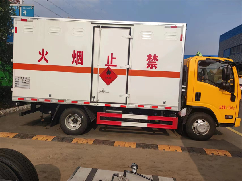 三、上装配置: 厢体采用双层复合板结构:外板为δ1.2mm冷轧钢板,货厢内蒙皮为δ1mm铝板,中间为矩形管架焊接固定和B1级阻燃隔热材料填充,货厢侧壁设置具有防雨功能的通风窗,厢体外部四周采用铝合金型材包边,货厢底板为δ3mm的钢板;货厢内可选装固定货物的卧环或卡槽;设置对开后货厢门,可选装侧门,货厢门密封条为具有防雨防尘的密封条;货厢内底板铺设阻燃导静电胶板;货厢内设置货物起火燃烧报警装置,货厢门上设置防盗报警装置;危险品运输车标配:静电带、安全告示牌、危险品牌、反光标示及警告标志、灭火器、危险品三角顶灯、排气管火花熄灭装置。