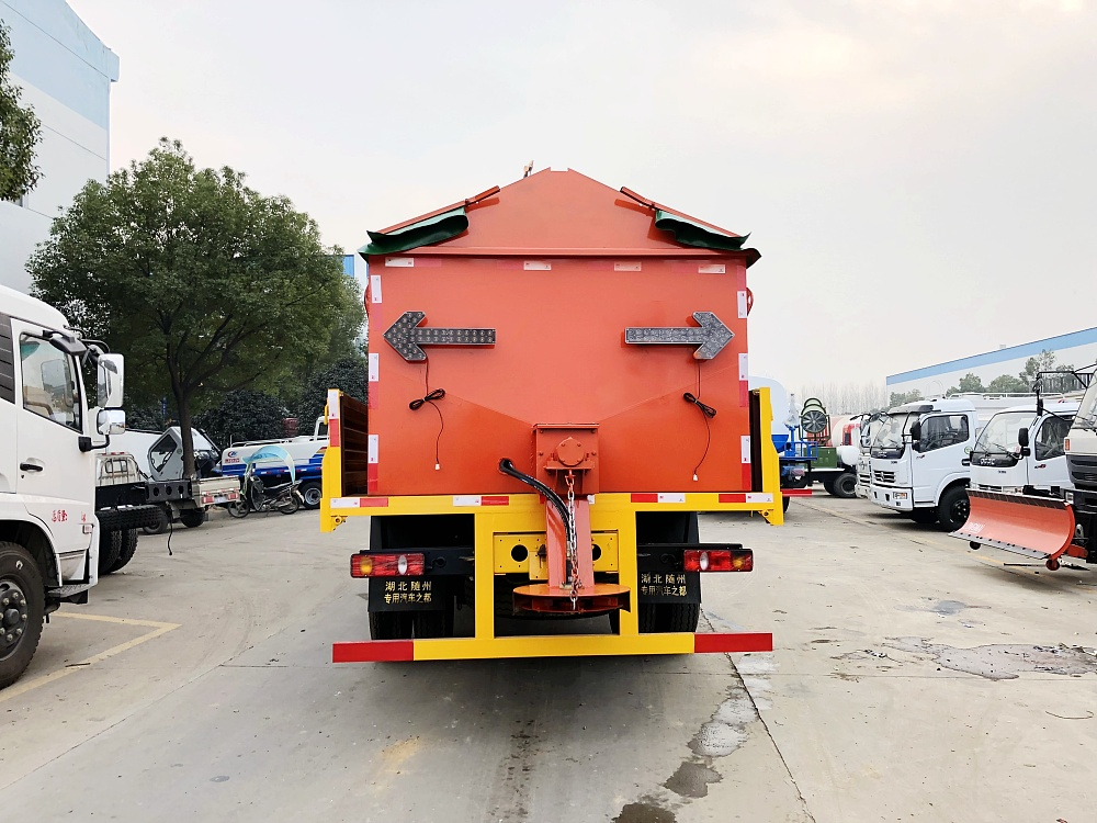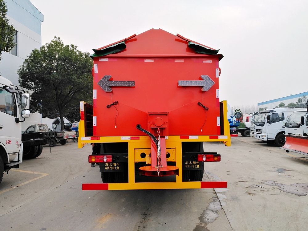 融雪剂撒布机产品性能特点说明: 1、具有撒布盐、融雪剂等多种功能;2、撒布宽度、撒布量与行驶速度智能自动控制,计量稳定、准确、可靠;3、采用碳钢板或不锈钢机构,三级防腐处理;4、动力组选用国内知名品牌发动机;5、撒布量和撒布宽度的设置可直接在驾驶室内操作;6、撒布机螺旋输送或皮带输送,操作方便,性能可靠;7、撒布机箱体上部安装活动滤网,避免了大颗粒机杂物进入设备内,确保设备安全;8、料斗上防雨罩可保证整机在雨雪天正常工作;