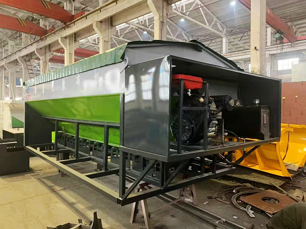 电启动发动机工作,通过液压泵带动马达旋转,把料斗中的融雪剂输送到撒料盘,由马达带动高速旋转的撒料盘把融雪剂均匀撒出。撒布机的物料分配抛撒机构由,固定桶、调节桶、溜槽和甩盘。融雪剂靠自重落入固定桶内,经调节桶、溜槽进入甩盘,靠甩盘高速旋转产生的离心力抛撒出去。根据承载汽车底盘高低不同,调节固定桶和调节桶的相对位置,以达到调节甩盘高低,满足不同车型使用;具有的翻转功能,可在设备不用时将甩盘机构翻至上方,方便运输、存放。