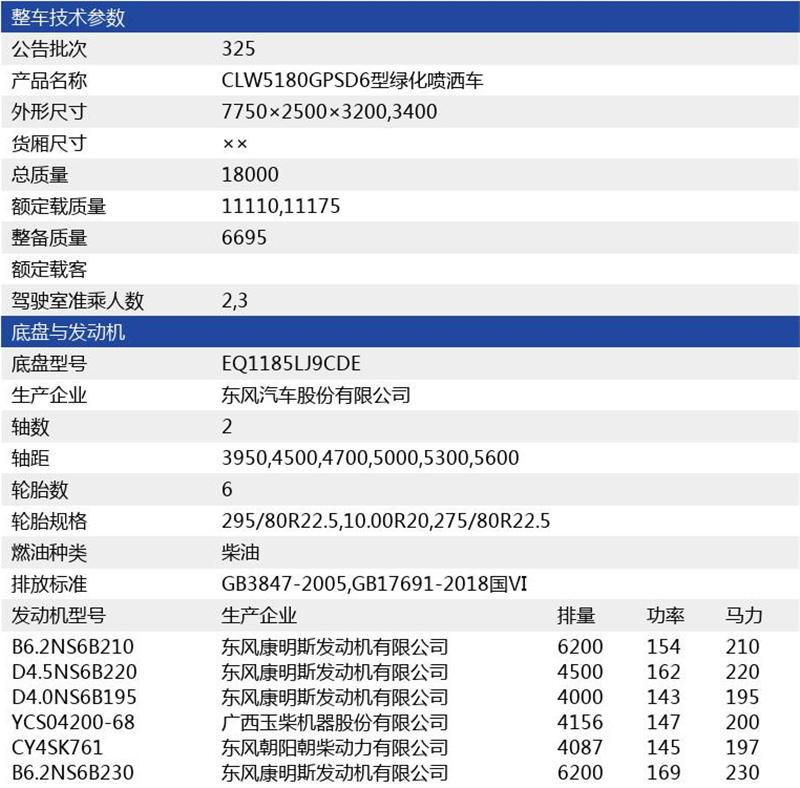 底盘配置:采用东风D9系列新款驾驶室,3950mm轴距,搭载国六(国Ⅵ)玉柴200马力柴油发动机/康明斯210匹马力柴油发动机,6档变速箱,9T后桥,295真空胎,方向助力、断气刹、电动窗、中控锁、ABS,原装空调,GB7258。